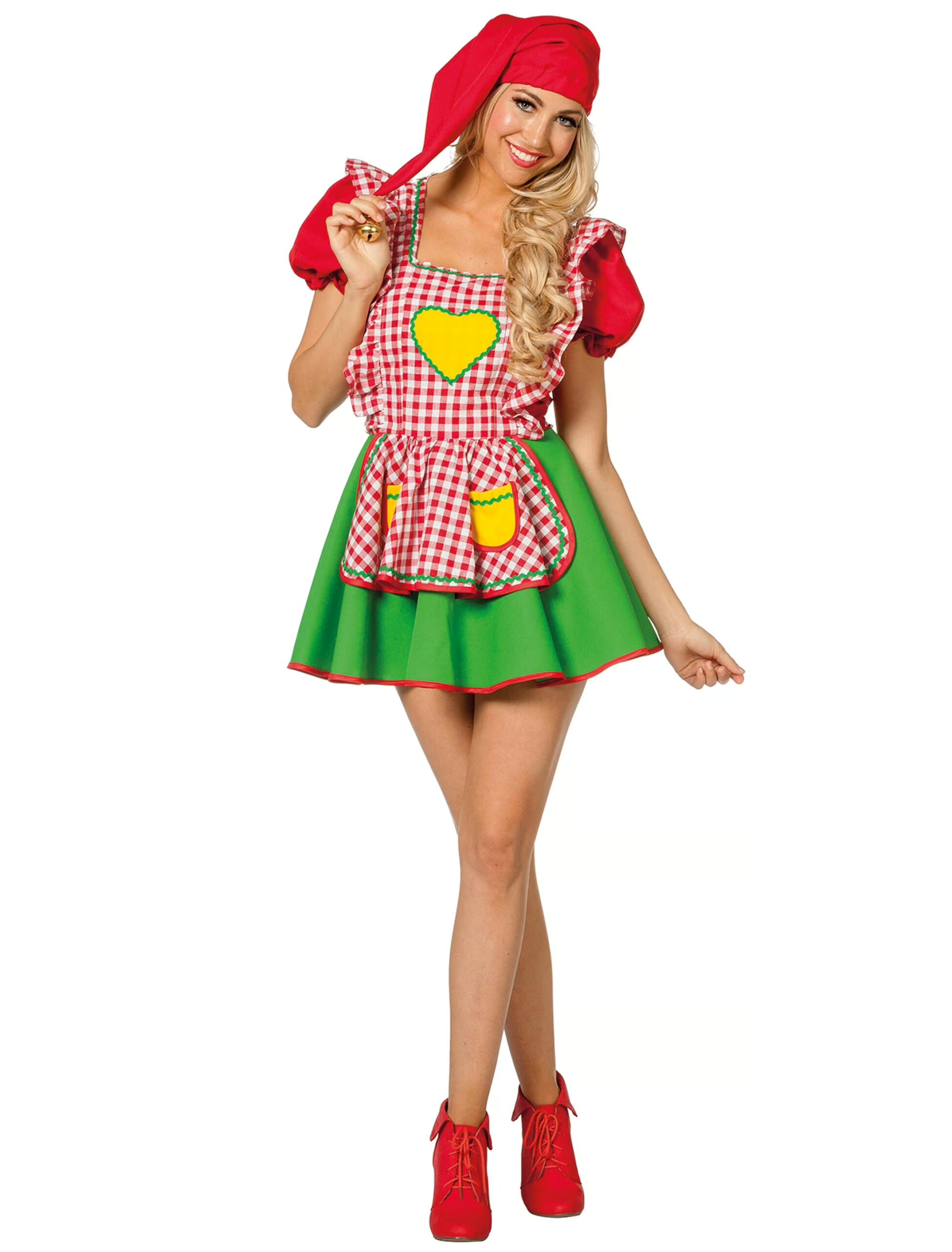 Begib Dich in das Land hinter den sieben Bergen zu den sieben Zwergen und verzaubere dort Deine Mitmenschen mit diesem ausgefallenen zweiteiligen Damenkostüm. Enthalten sind hier eine rote Zipfelmütze und ein figurbetontes Kleid mit einem breiten, grünen Faltenrock mit rotem Saum an der Unterkante, einem eng geschnittenen, roten Oberteil mit Puffärmeln und einer rot-weiß kartierten Schürze mit einem gelben Herz auf der Brust und zwei kleinen, gelben Täschchen am unteren Ende. Beide Teile bestehen zu hundert Prozent aus Polyester. Abgerundet mit den passenden roten Schuhen bist Du definitiv der Hingucker auf jeder Karnevalsparty.